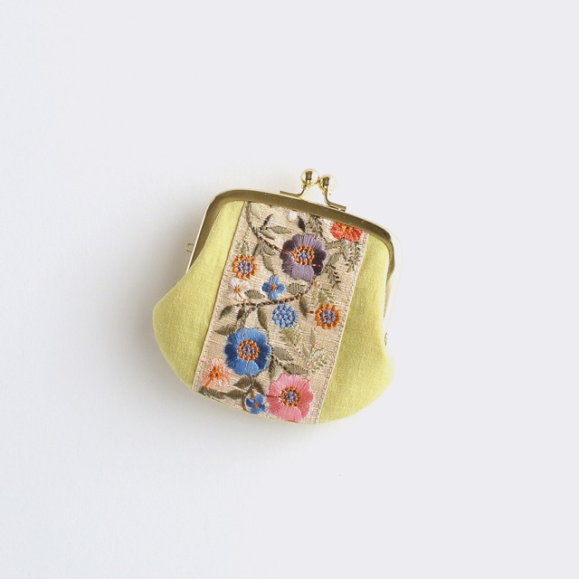インド刺繍リボンの手のひらがま口ポーチ イエロー