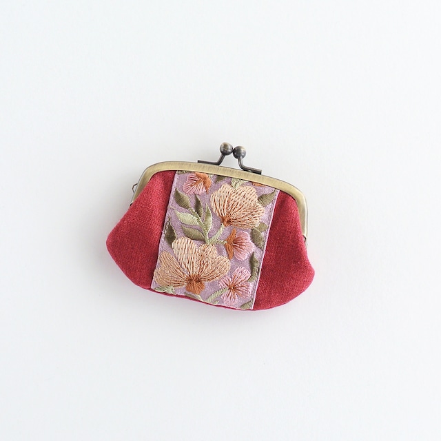 リネンとインド刺繍リボンのミニがま口 赤