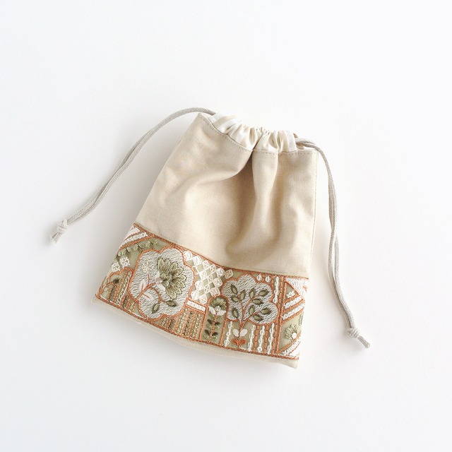 インド刺繍リボンの巾着ポーチ