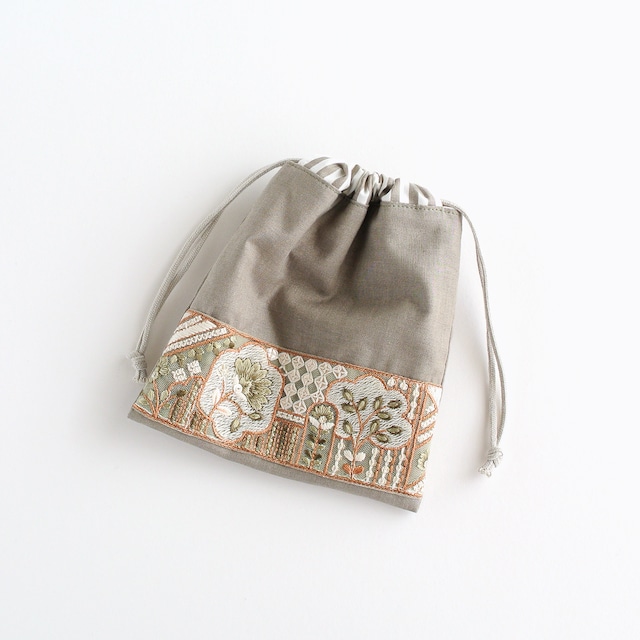 インド刺繍リボンのマチのある巾着ポーチ グレー