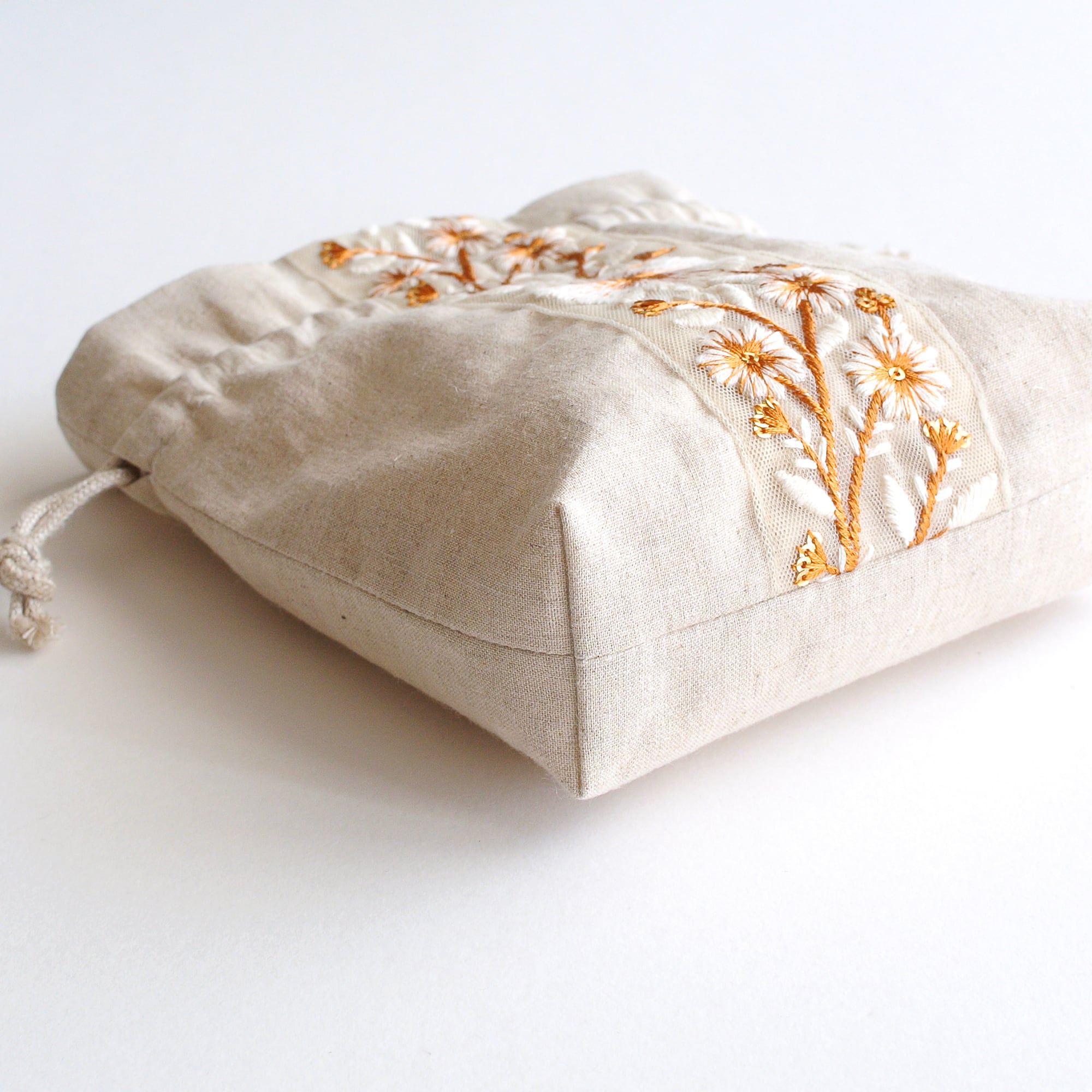 インド刺繍リボンのマチのある巾着ポーチ 生成り