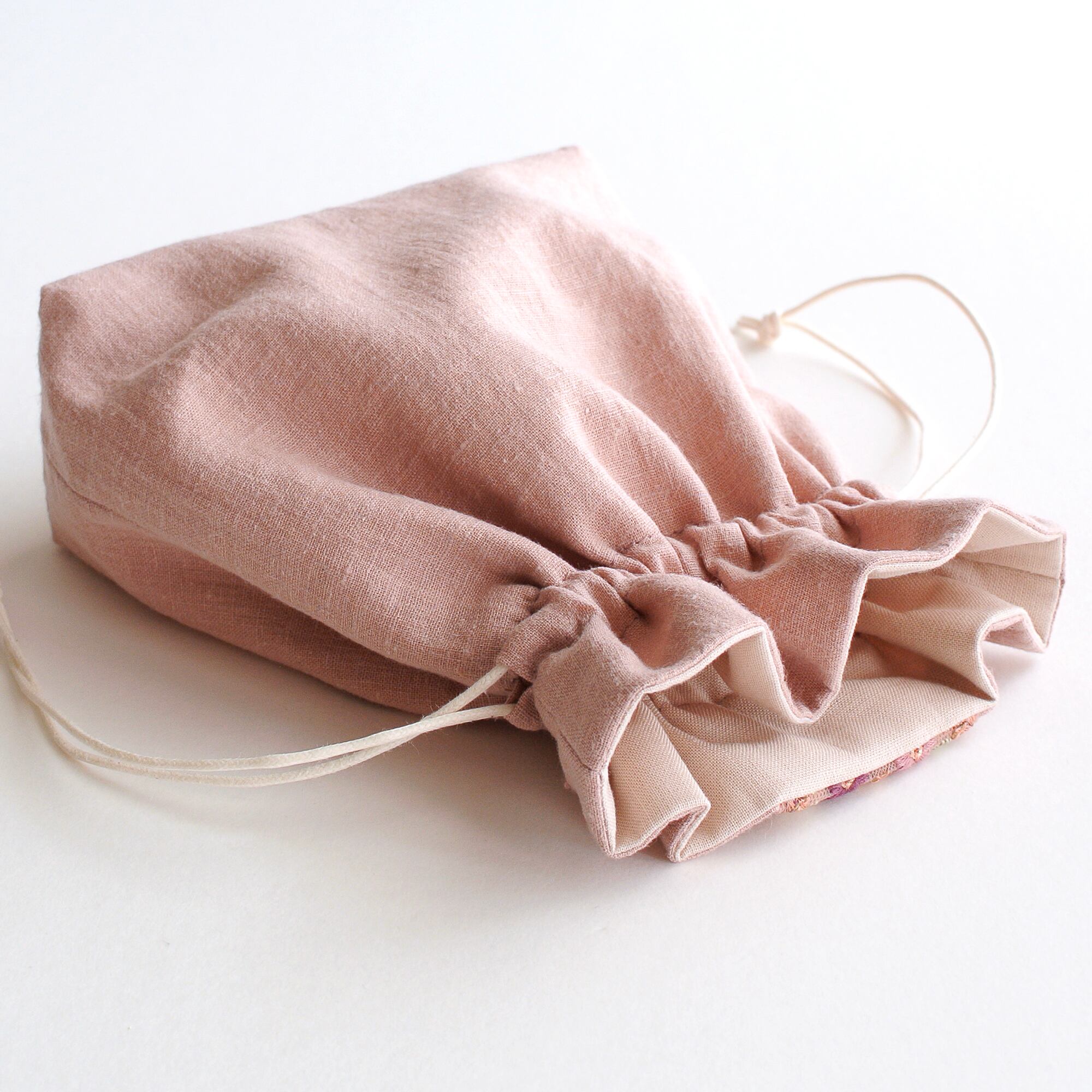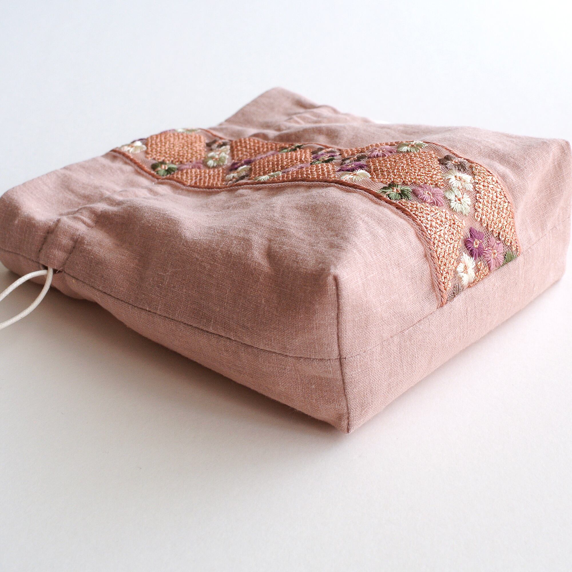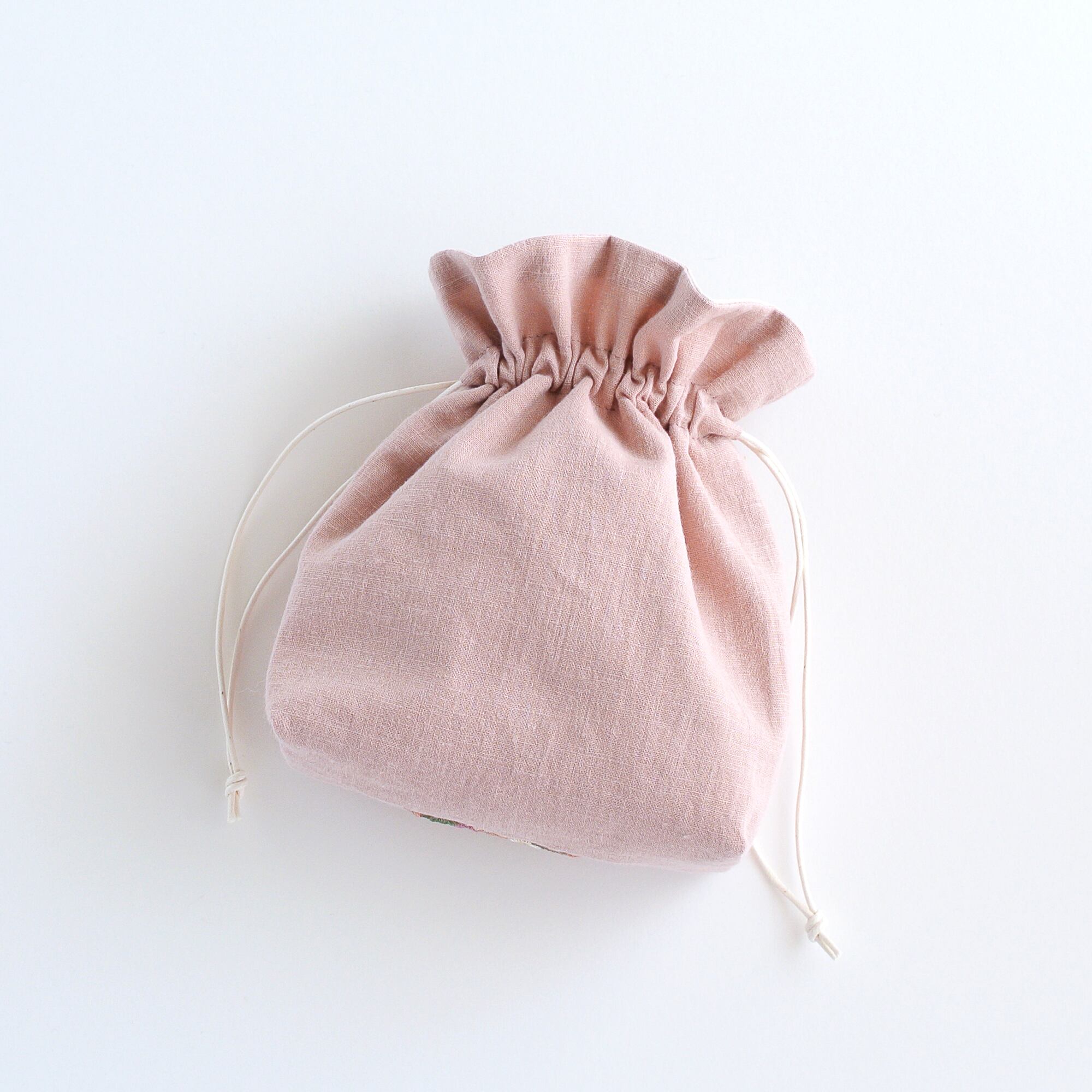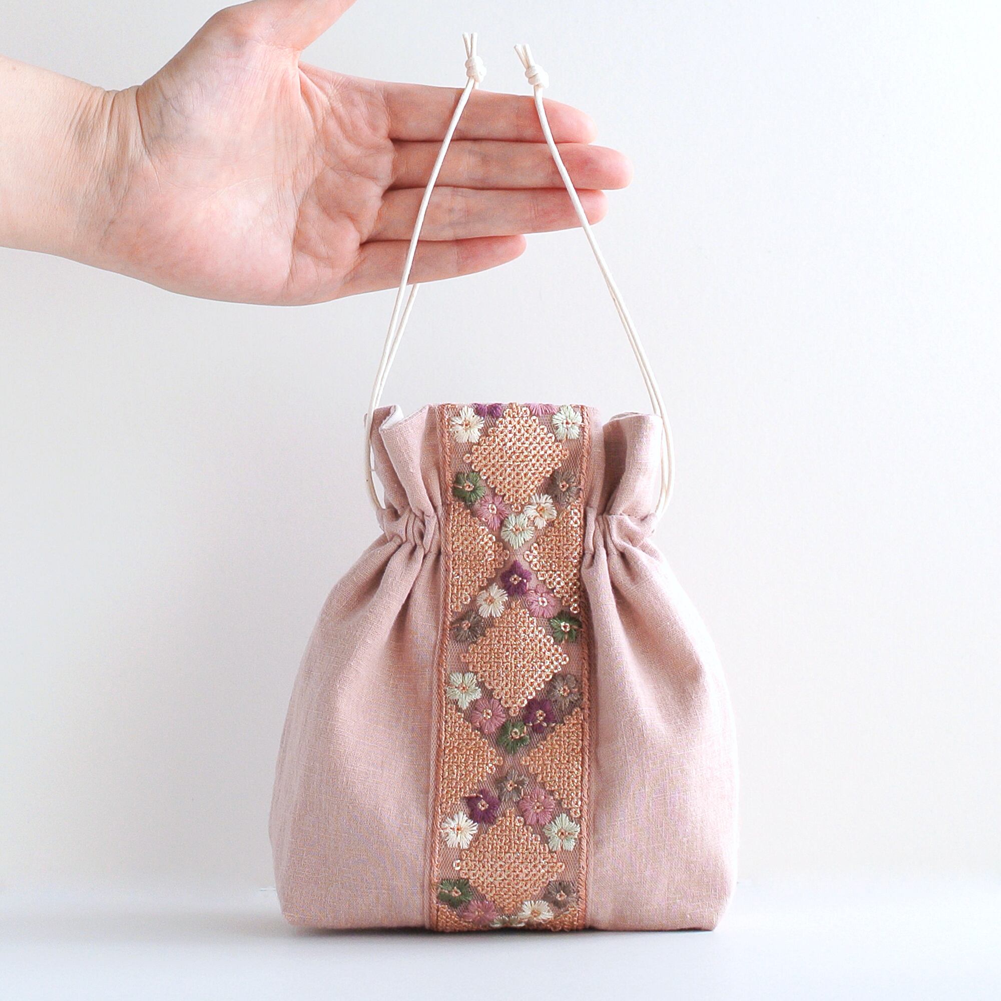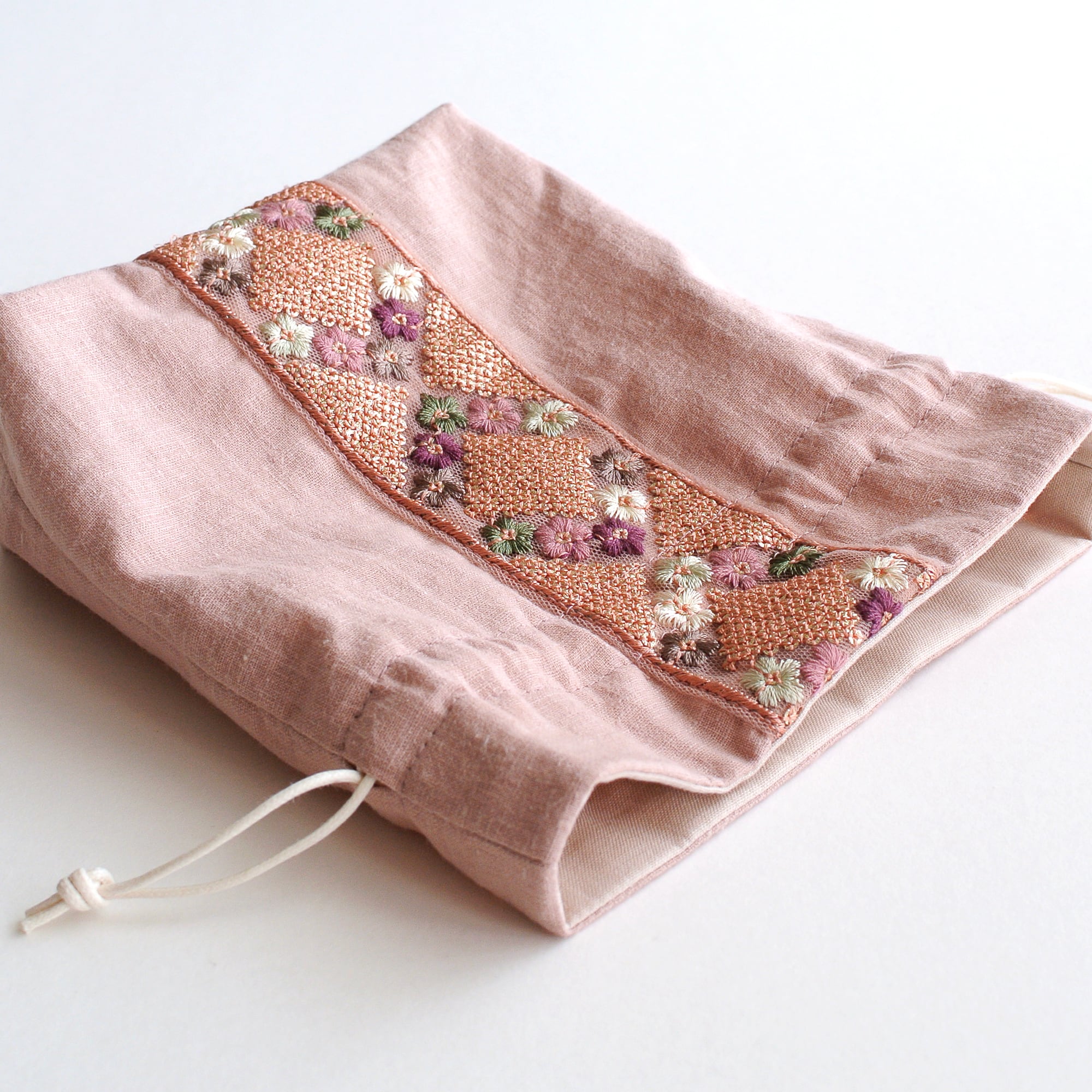 インド刺繍リボンのマチのある巾着ポーチ くすみピンク