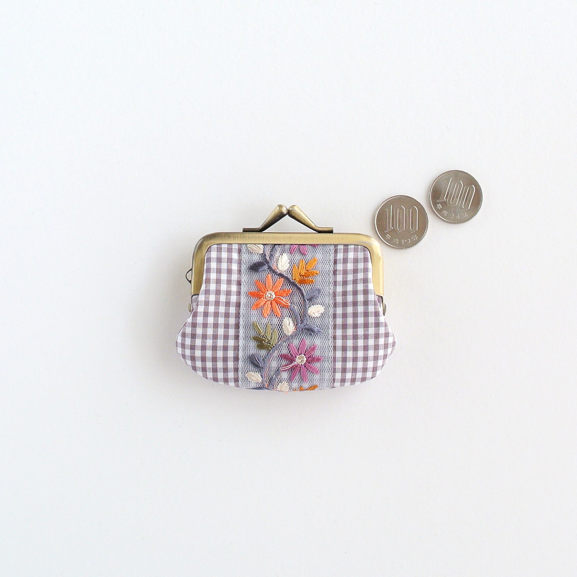 グレーパープルのギンガムチェック生地にインド刺繍リボンを合わせてかわいらしい雰囲気に仕上げました