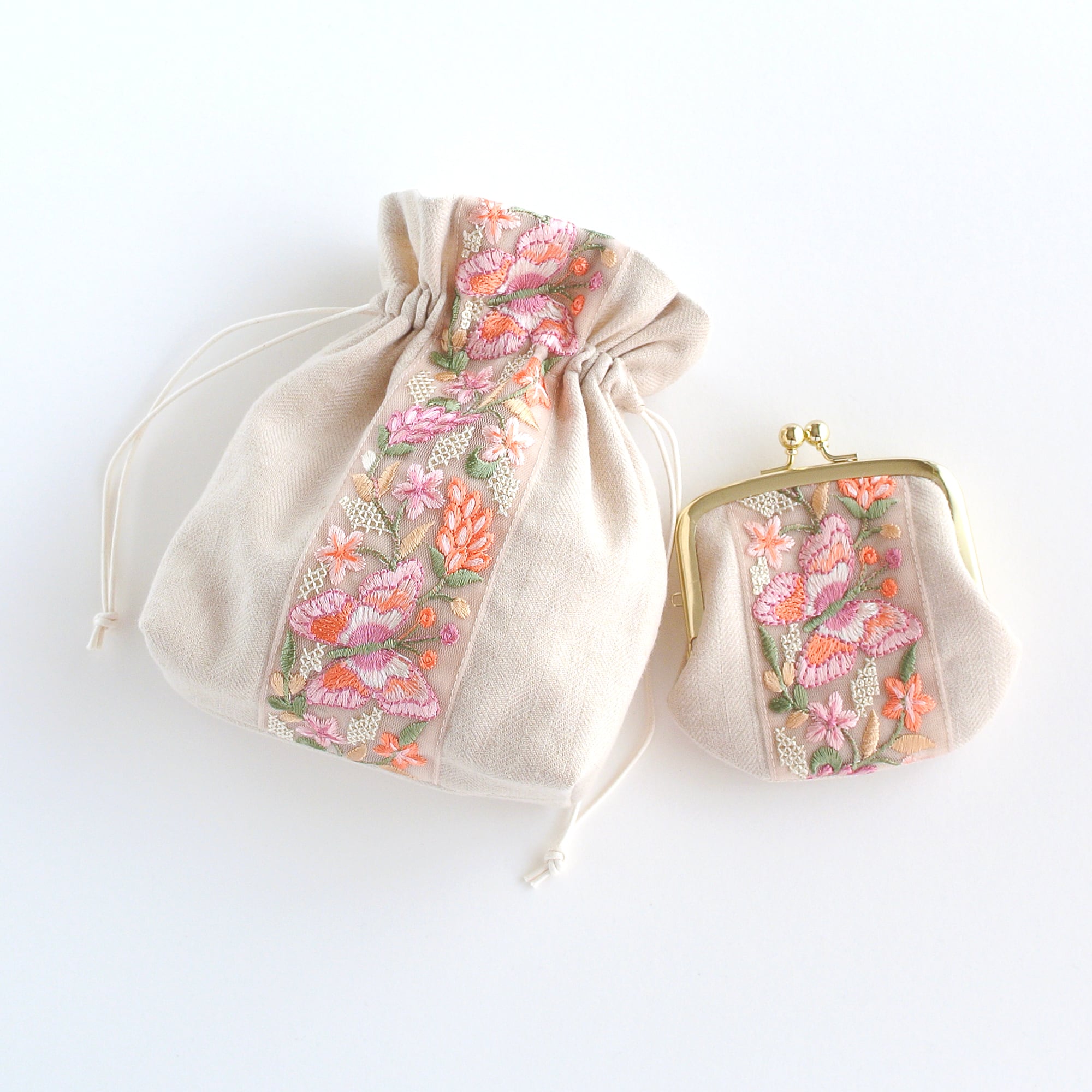 インド刺繍リボンをあしらったマチのある巾着ポーチ