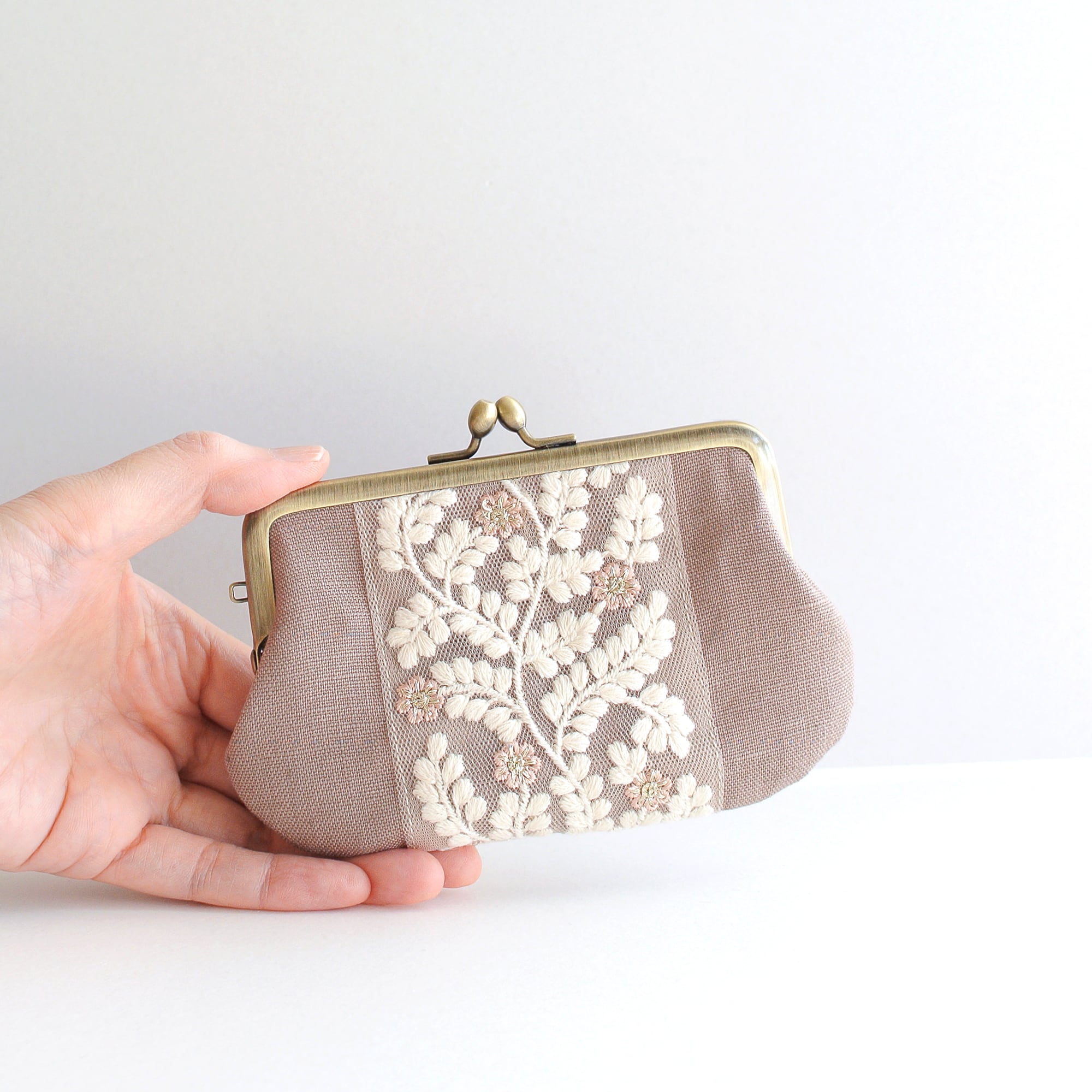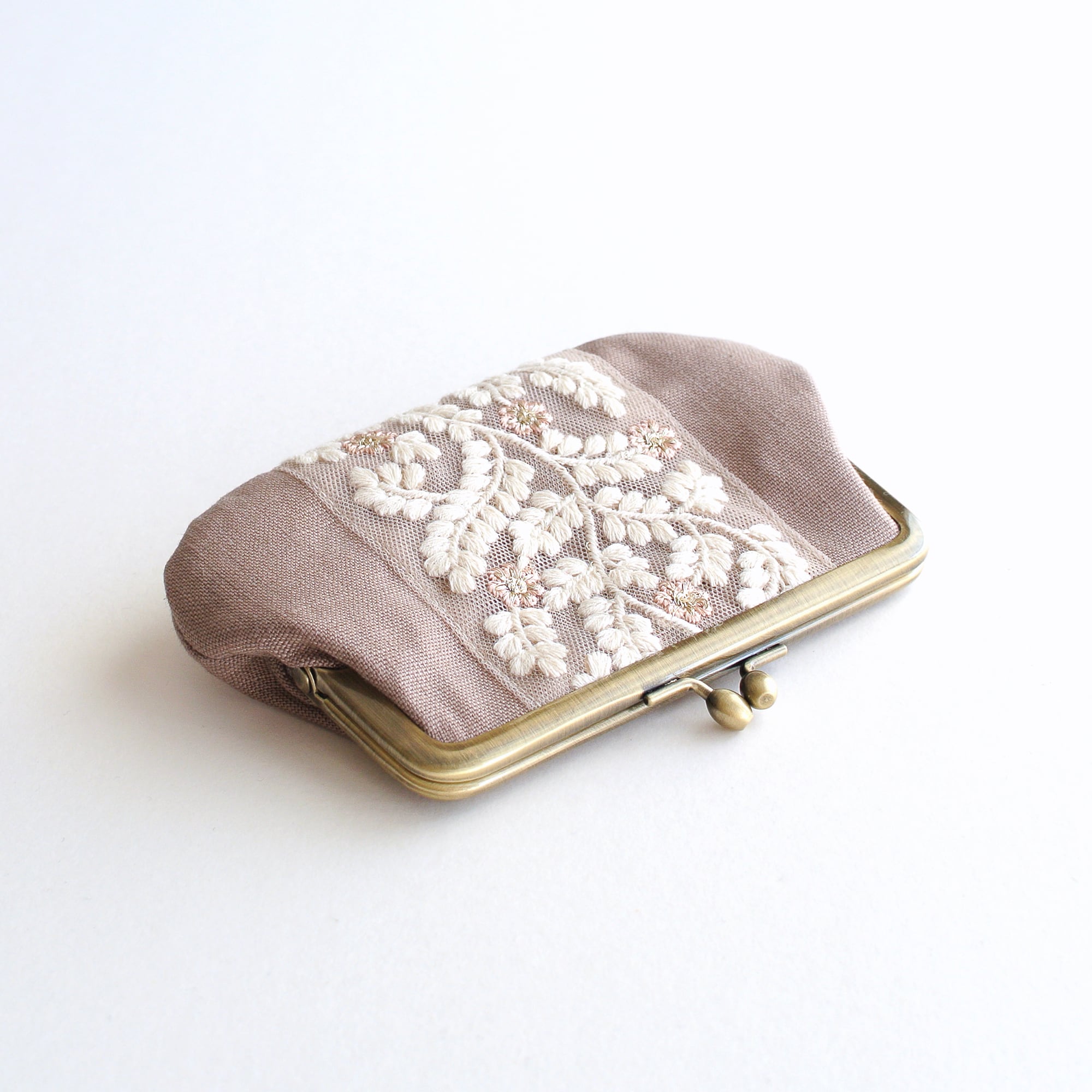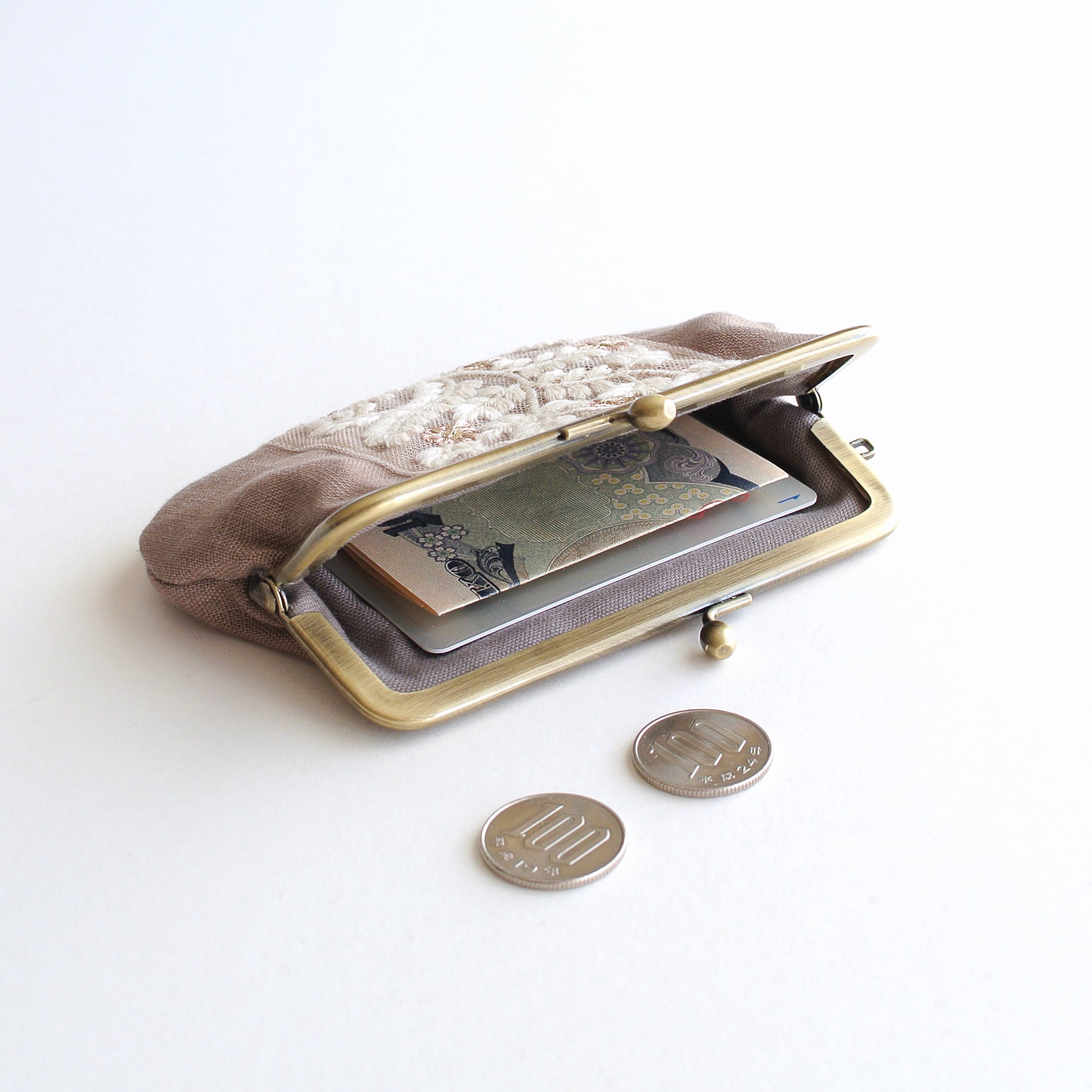 リネンとインド刺繍リボンのがま口ミニ財布/ポーチ モカベージュ
