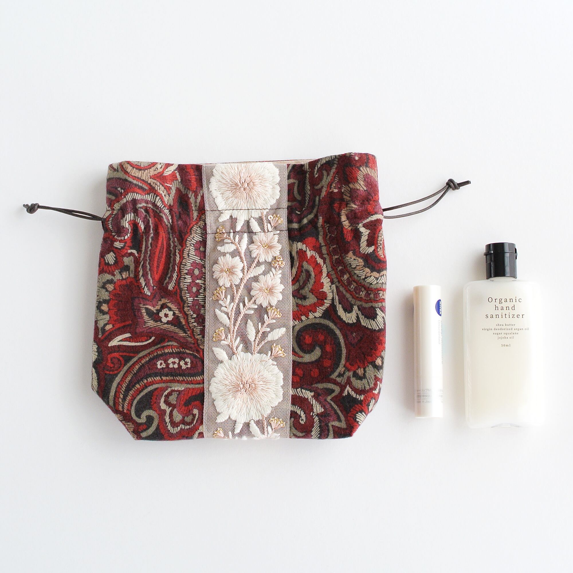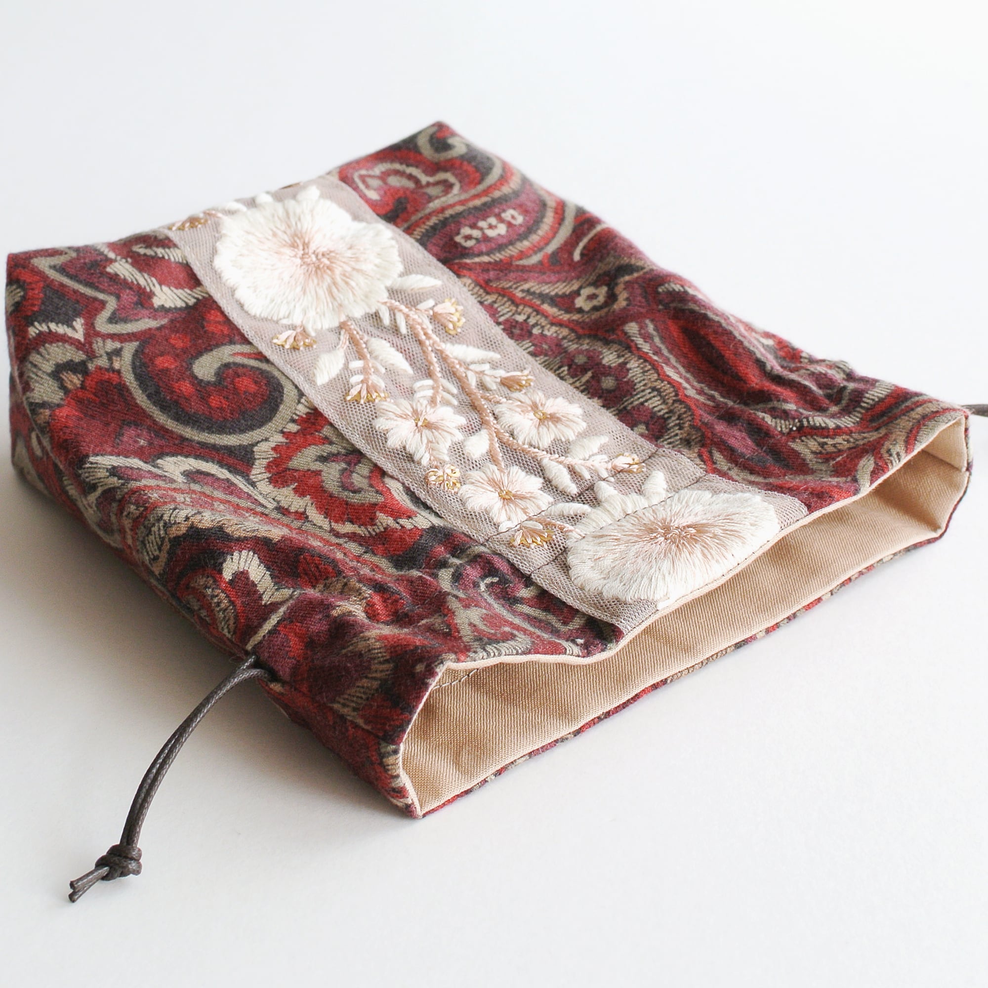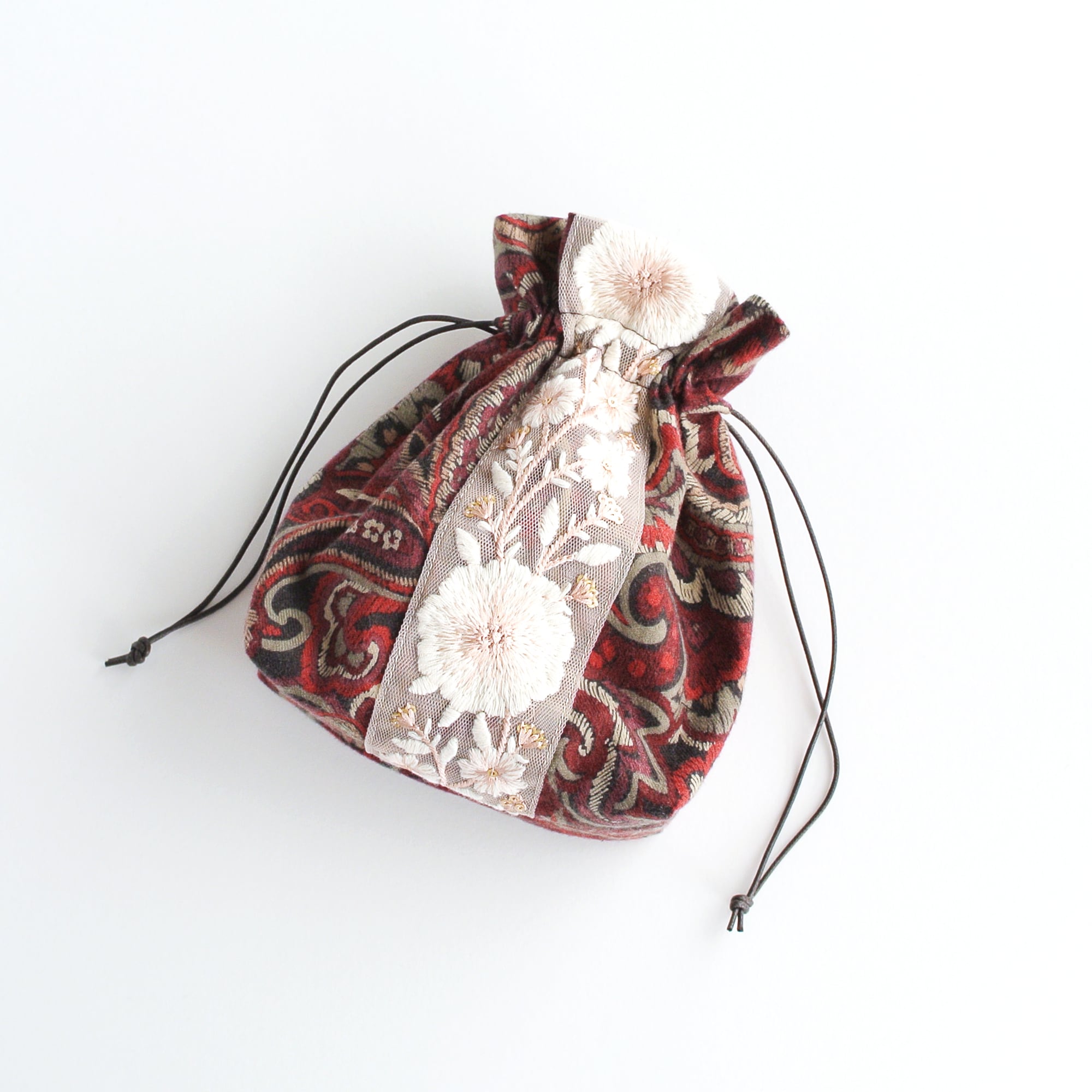 インド刺繍リボンのマチのある巾着ポーチ ビエラペイズリー赤