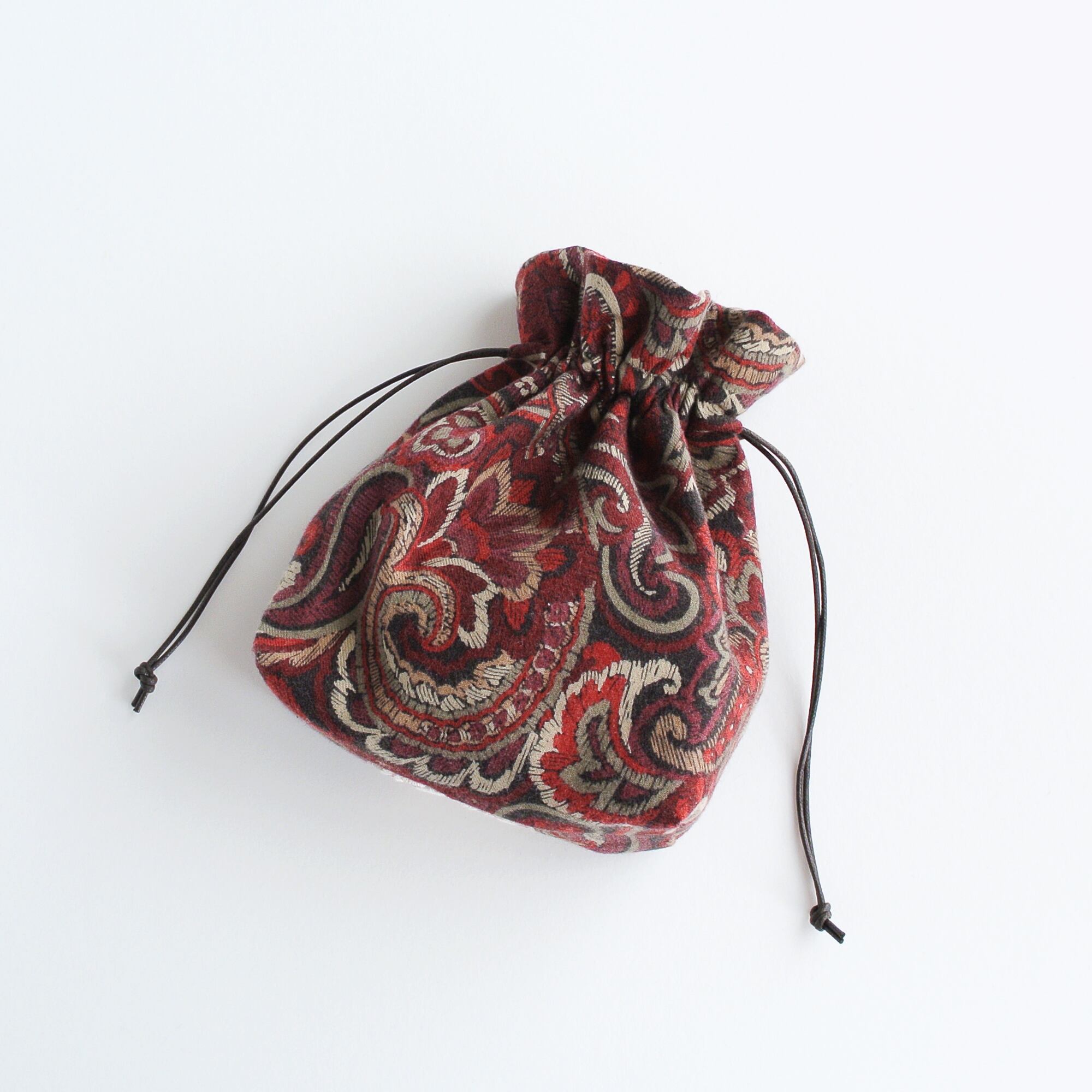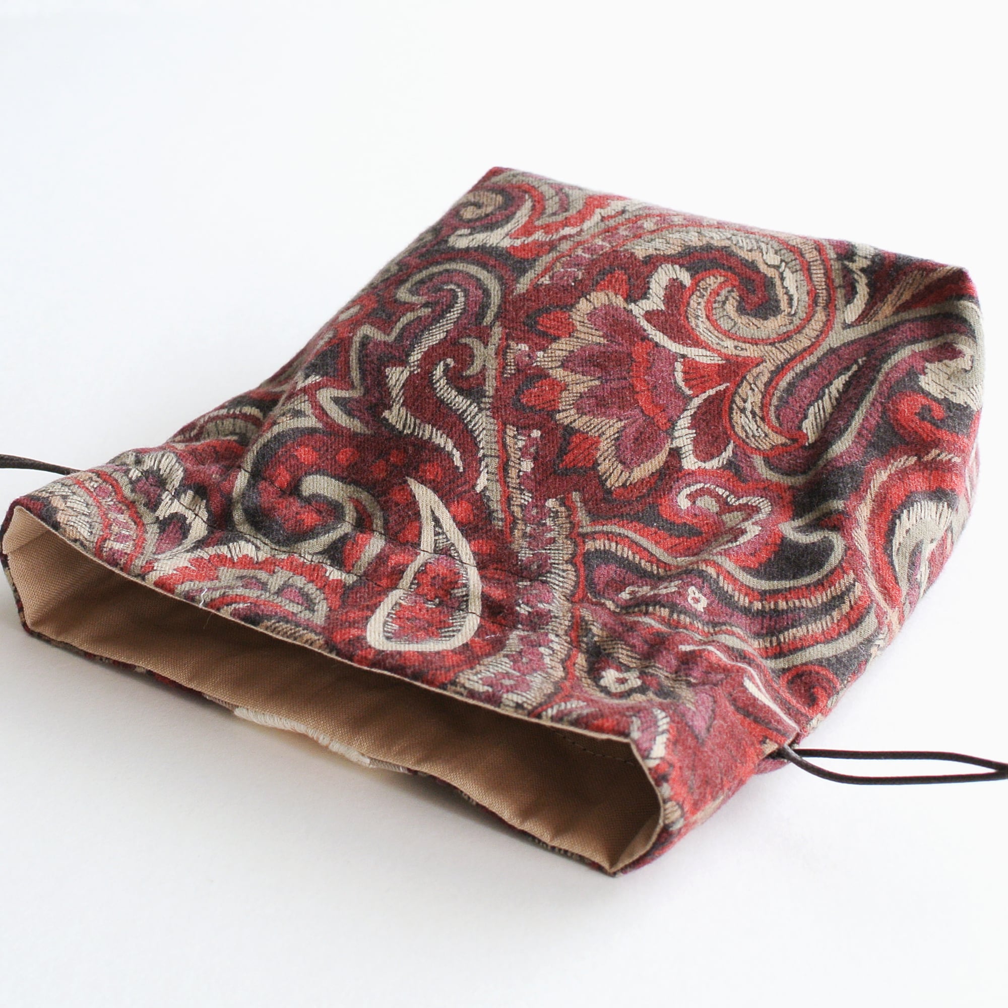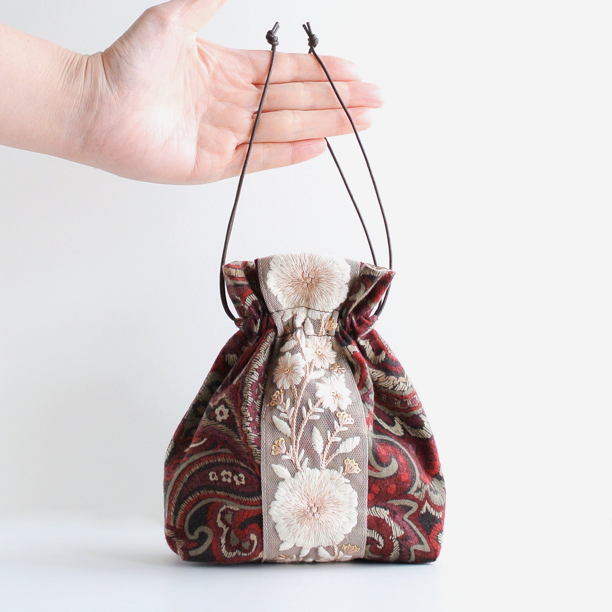 インド刺繍リボンのマチのある巾着ポーチ ビエラペイズリー赤