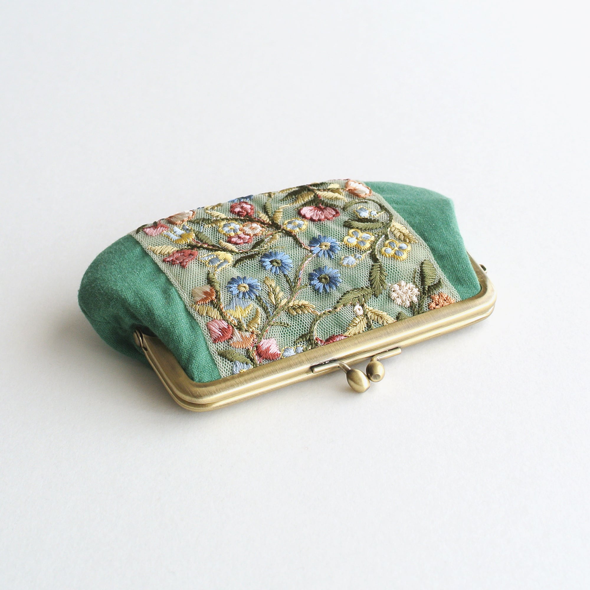 インド刺繍リボンのがま口ミニ財布/ポーチ グリーン