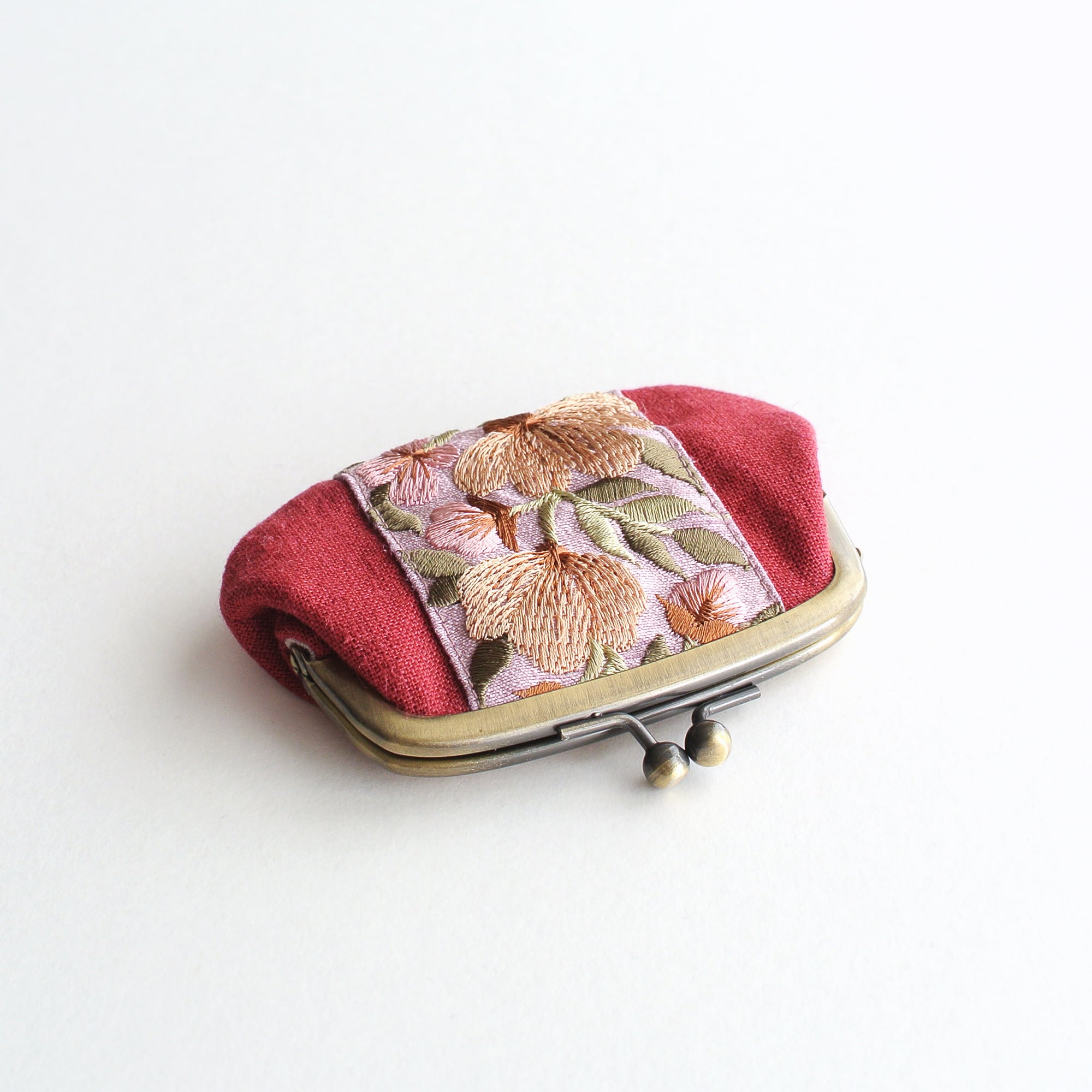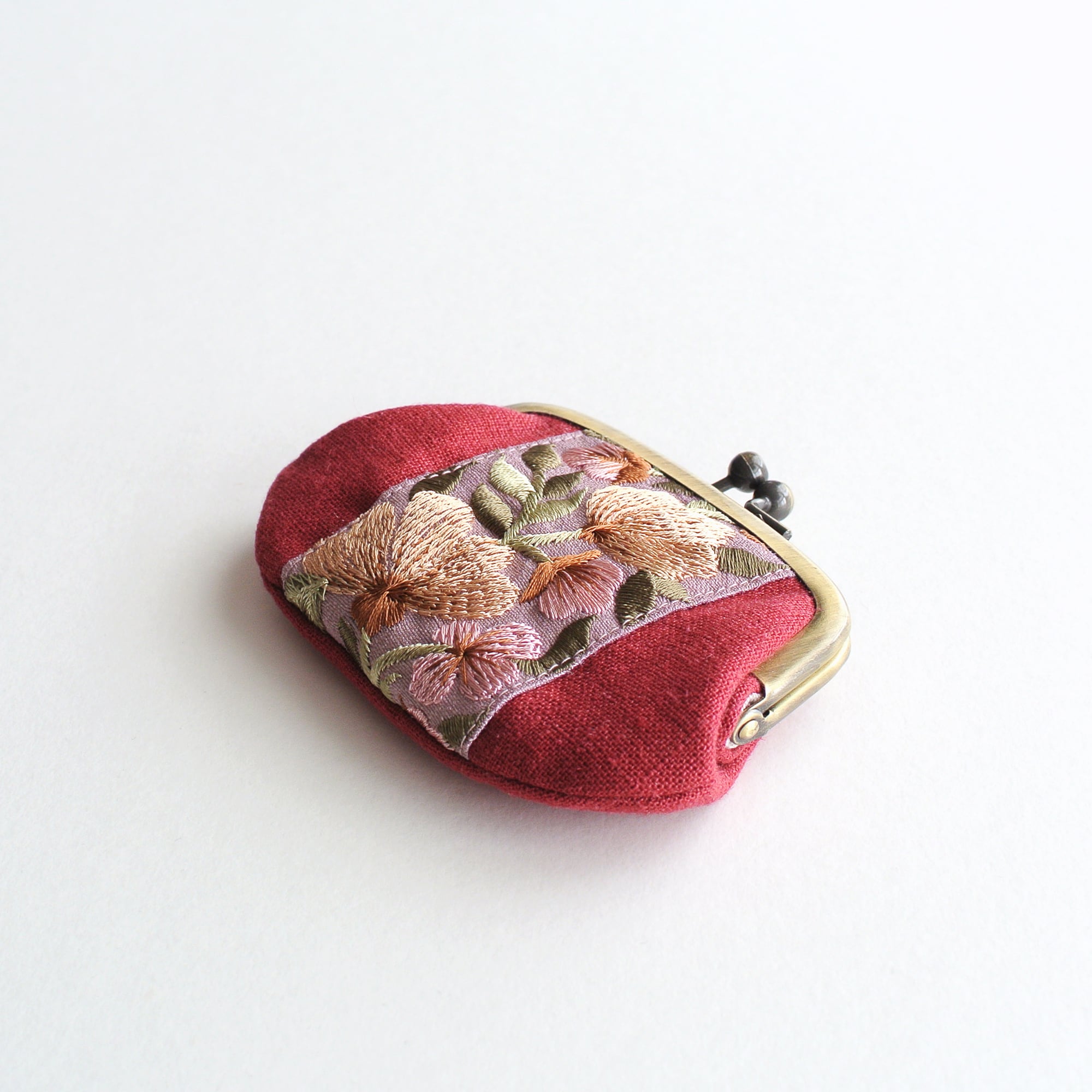 ナチュラルなリネン生地にインド刺繍リボンを合わせて華やかに仕上げたがま口です