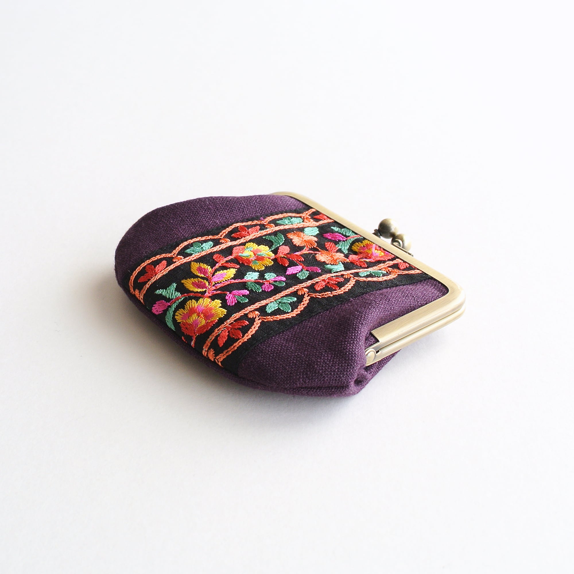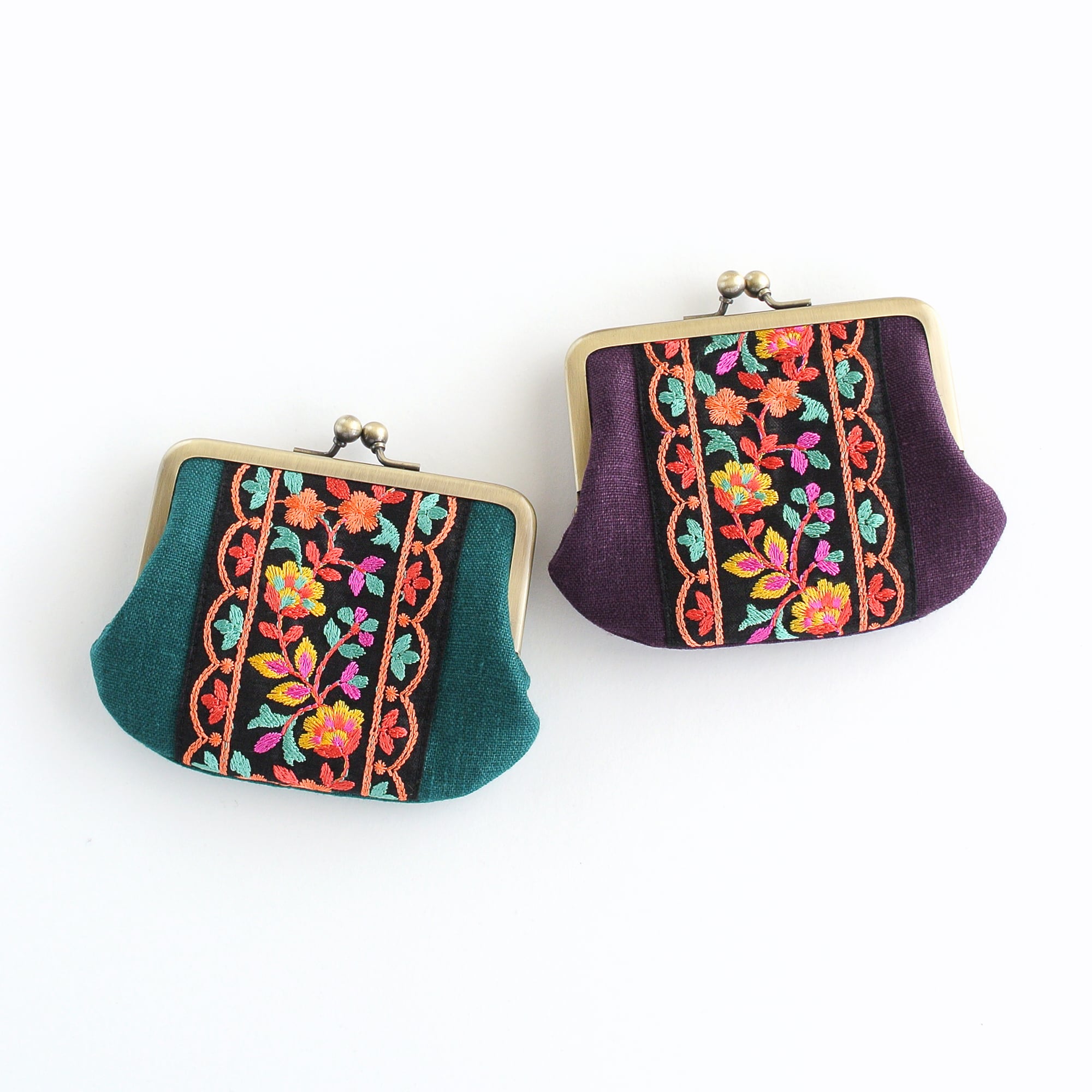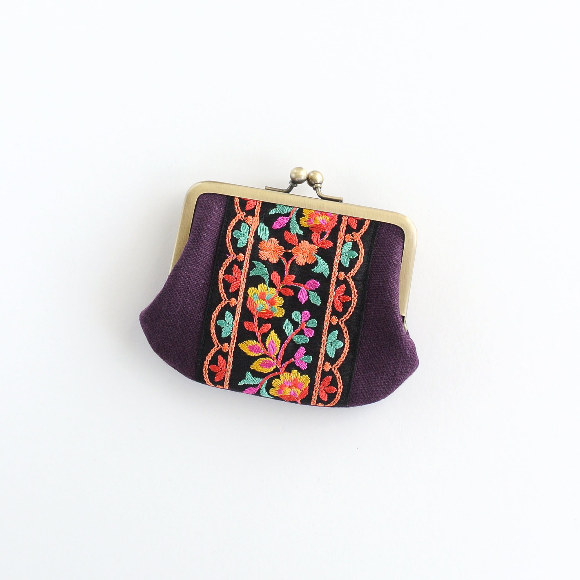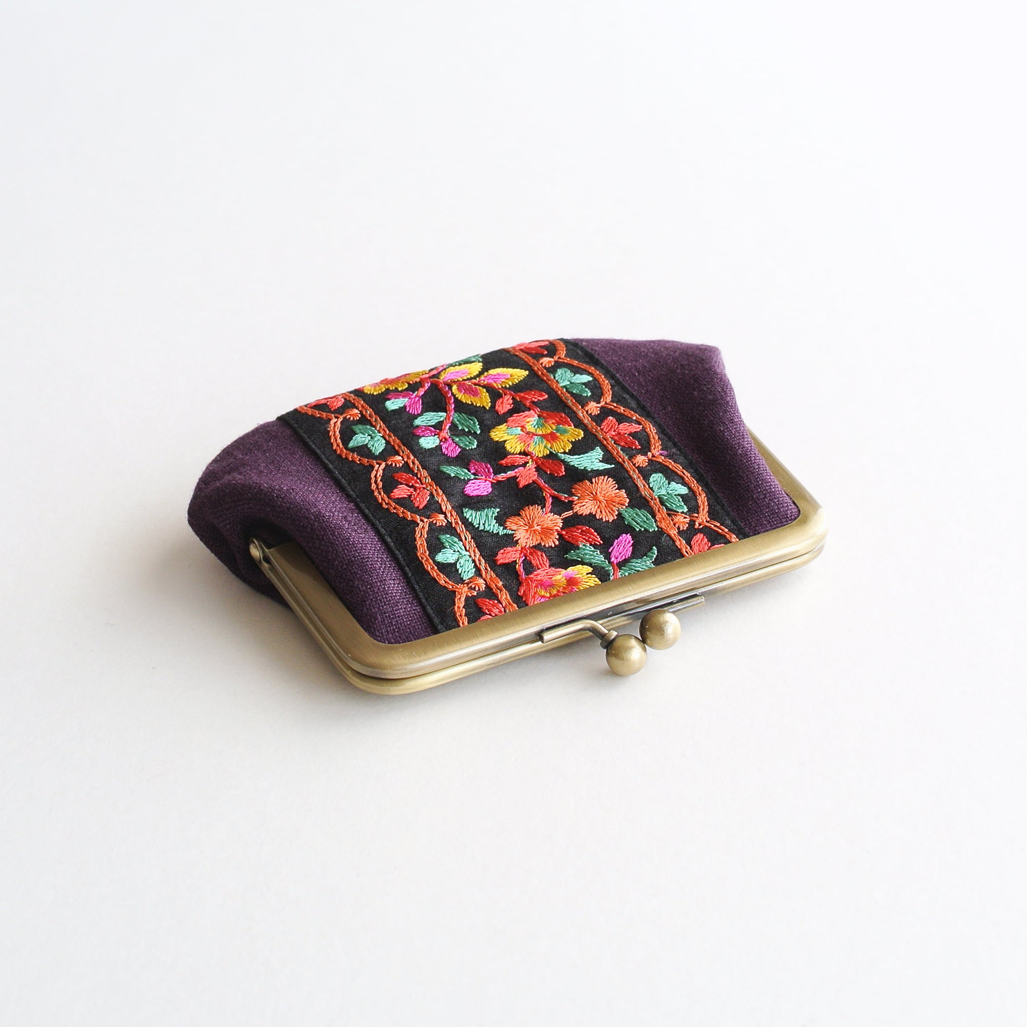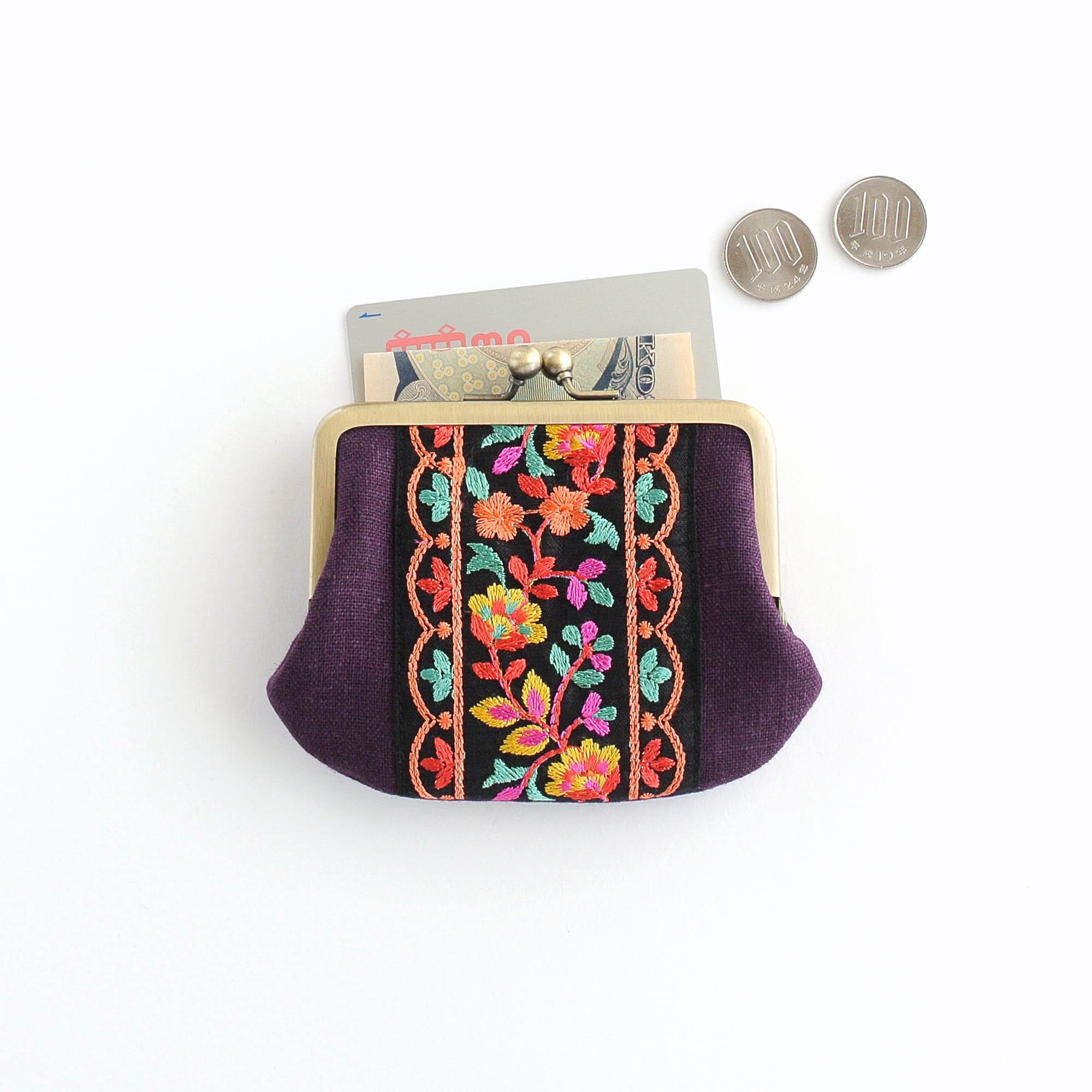 インド刺繍リボンをあしらった小回りの利くサイズのがま口ポーチ