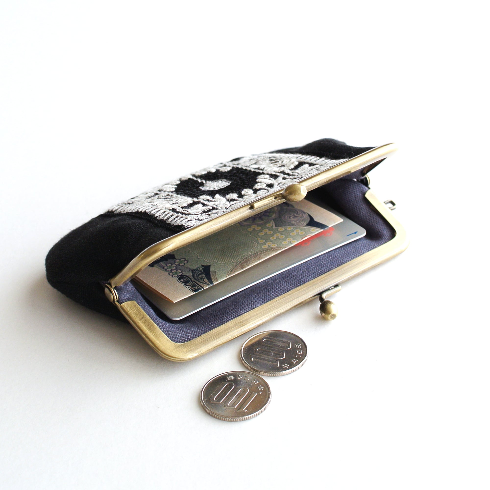 リネンとインド刺繍リボンのがま口ミニ財布/ポーチ ブラック