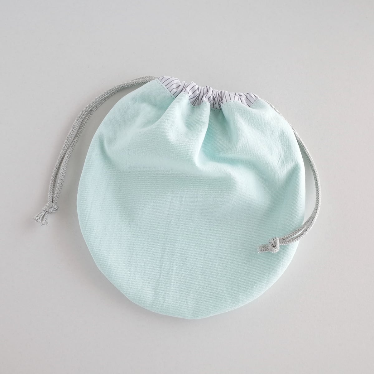 ・表と中を同じ生地、紐通し口をストライプにしてアクセントにしました