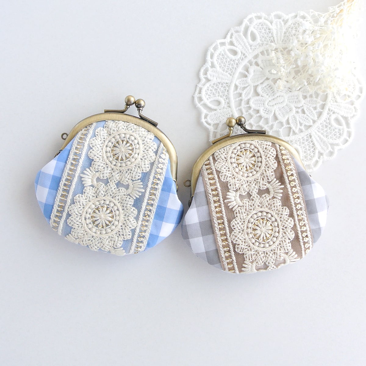 インド刺繍リボンのぽってりかわいい小さいがま口ポーチ チェック