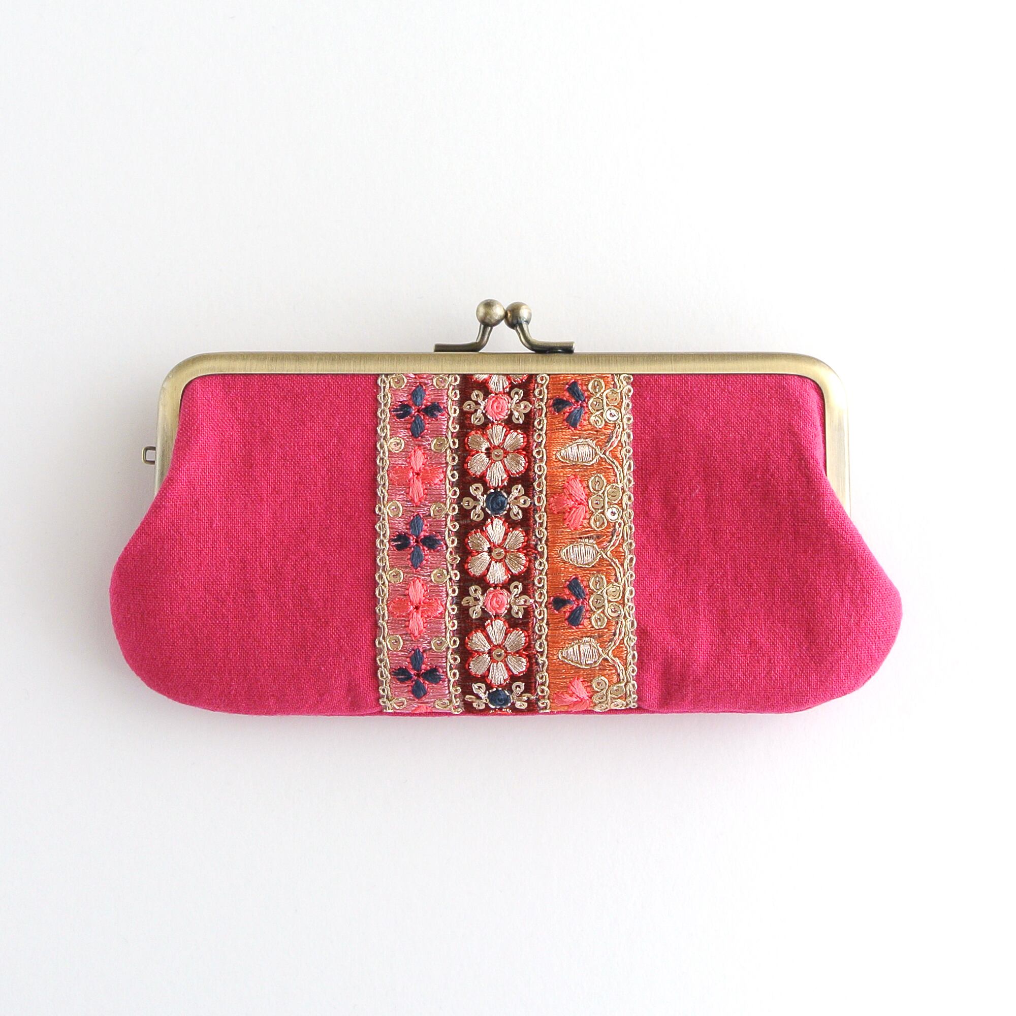 インド刺繍リボンをあしらって華やかに仕上げた横長がま口ポーチ
