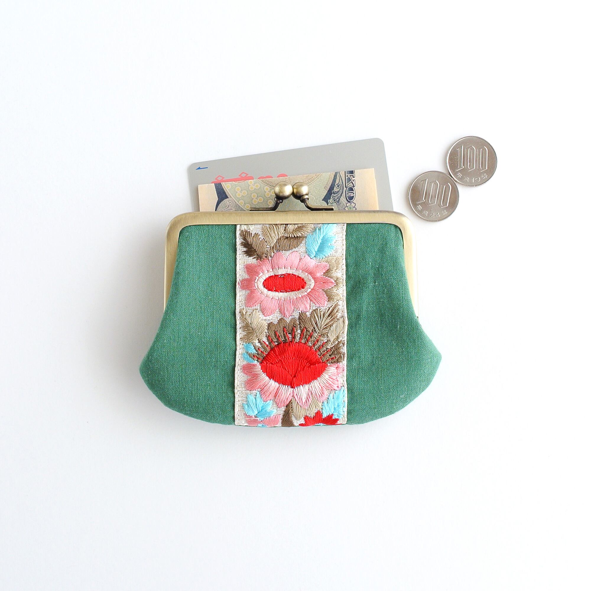 インド刺繍リボンのシンプルながま口 ミニ財布 グリーン