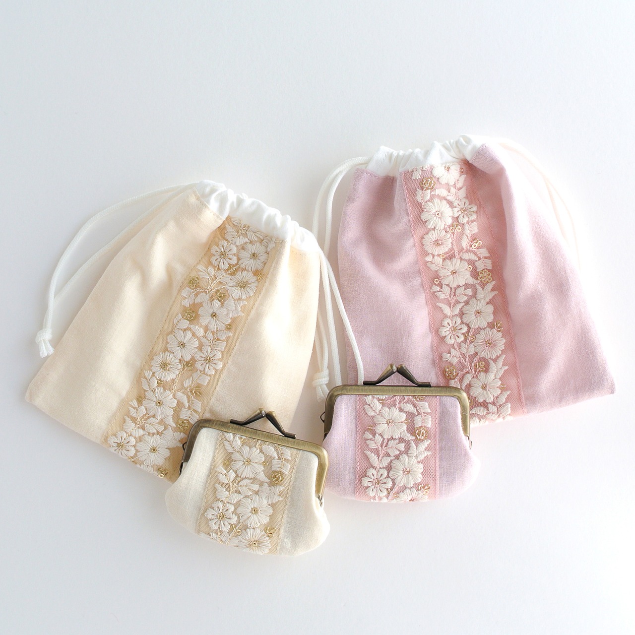 クリーム色のハーフリネン生地ににインド刺繍リボンを合わせてかわいらしい華やかな雰囲気に仕上げました